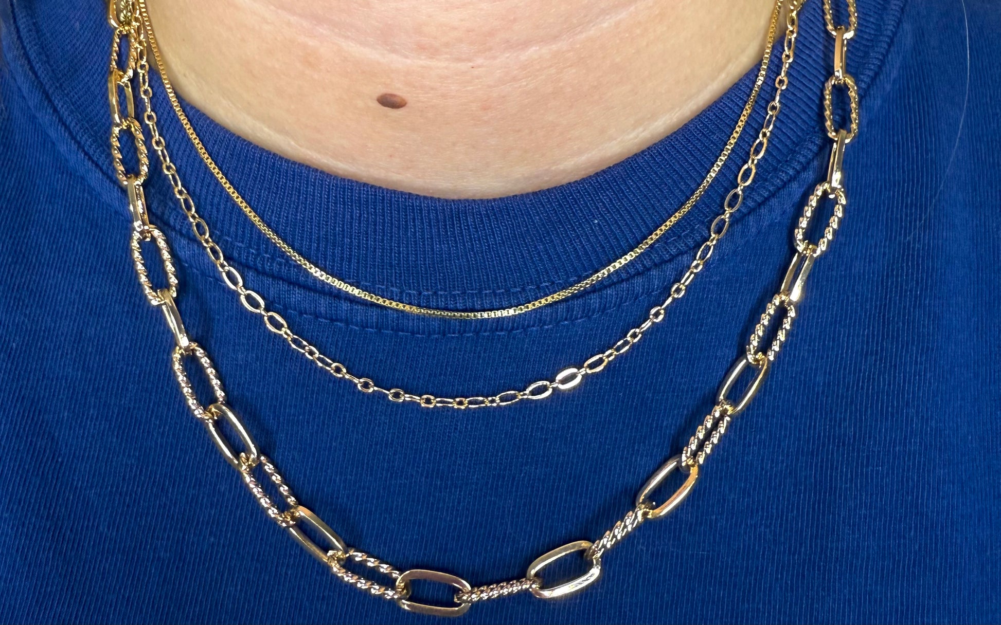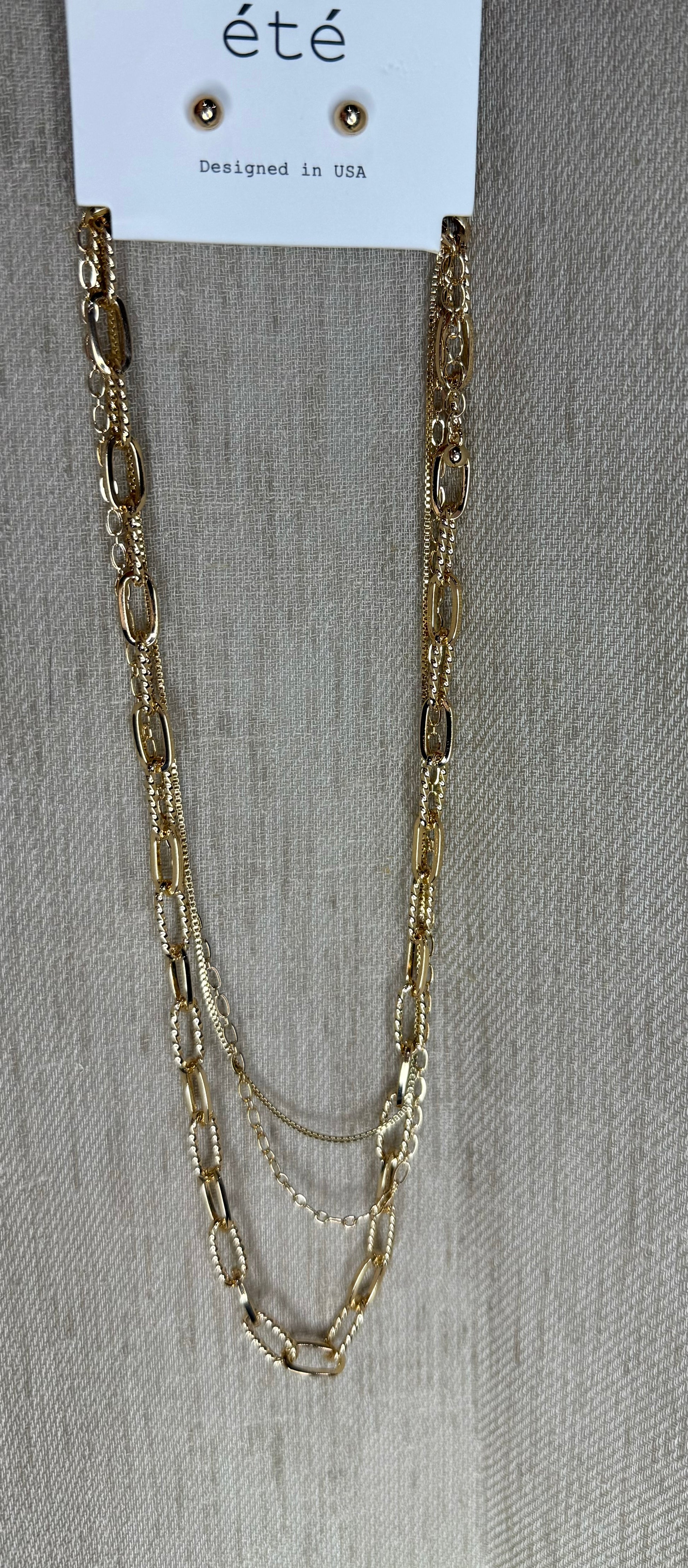 This gold triple layered stack necklace is a versatile and stylish accessory. The adjustable clip chain allows for a perfect fit, while the bead stud earrings add a unique touch. Elevate any outfit with this modern and elegant piece.