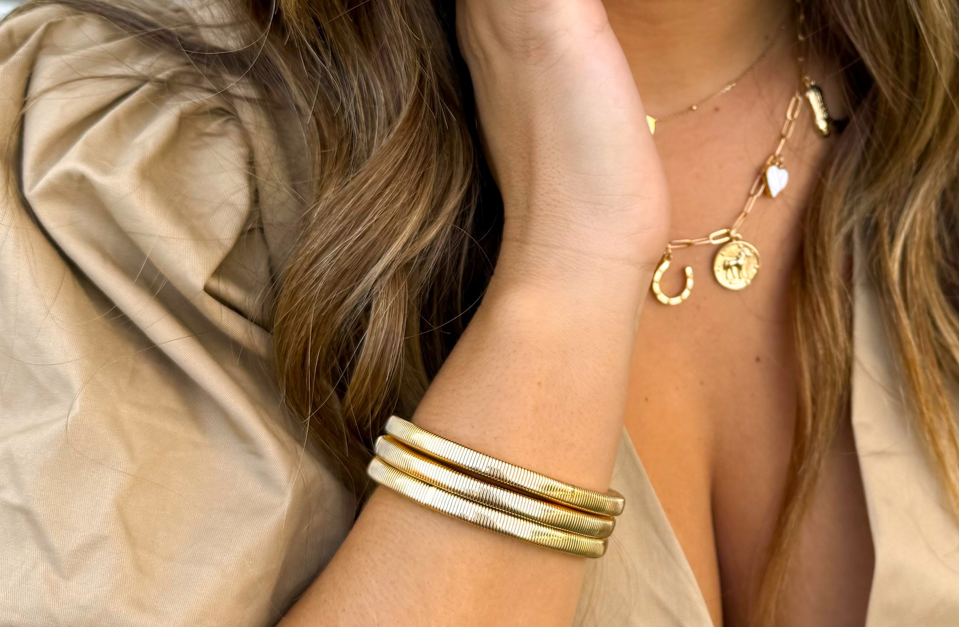 Enhance your everyday style with our Set of 3 Gold Ribbed Stretch Bracelets. These elegant bracelets feature a unique ribbed design and squared shape, adding a touch of sophistication to any outfit. Made with high-quality materials, they are also stretchy for a comfortable fit. Elevate your accessory game today.